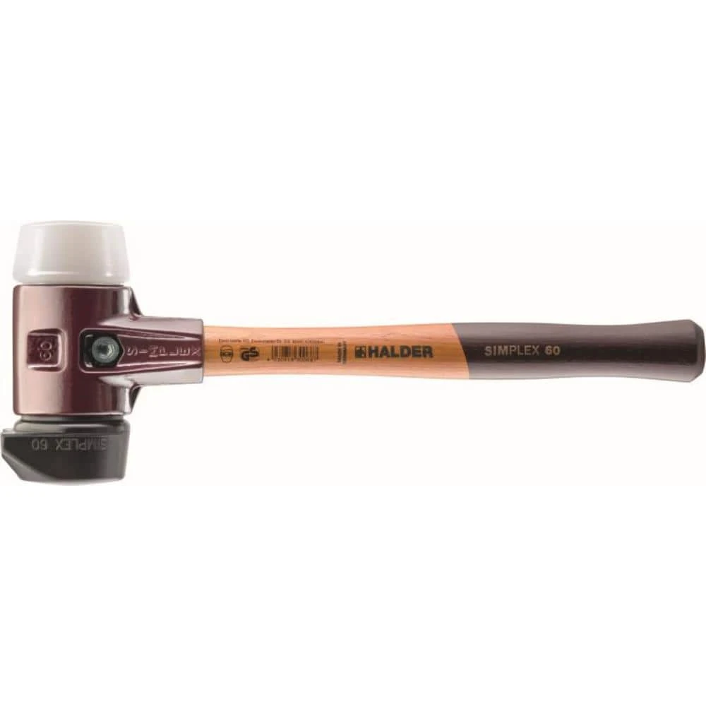 The Halder Simplex Mallet is the signature hammer in the Halder line. This patented hammer has a split housing design that is made from Heavy-Duty cast iron. This split housing allows it to be take apart and the components can be replaced when worn or damaged. It solidly locks in the variety of replaceable insert faces. The faces are made of several different durable materials, from soft rubber to medium hard plastic to hard nylon. Halder also offers aluminum and copper faces for hitting very hard surfaces such as hardened steel (copper faces are only compatible with Halder Simplex with reinforced cast iron housing, call for details). The variety of face materials and sizes allow the Simplex to be used in many applications such as manufacturing, automotive, landscaping, furniture making, flooring and machining just to name a few. The Simplex features the highest quality hickory handle which is protected by an extra-large overstrike area formed by the cast iron housing. This truly is a durable hammer and will be with you for many years.