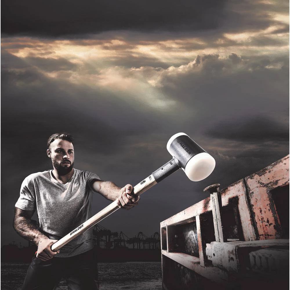The Halder Supercraft non-rebounding, dead blow hammer virtually eliminate bounce back and vibration, making this a very worker friendly tool. Its high quality construction includes a completely welded and sealed canister filled with steel shot. This steel shot absorbs the energy when struck. The Supercraft features extremely durable nylon face inserts that allow for a powerful strike yet will not leave marks. These faces can be replaced when worn out, making this an extremely long-lasting tool. This is an industrial grade dead blow hammer. This hammer was originally designed to hit steel as a replacemnt to those using brass, bronze, lead, and steel hammers in industrial settings. It will not mushroom, or produce dangerous sharpnel making this a much safer alternative to traditional steel hammers. There is also no way that the steel shot can escape the welded steel housing which is a constant concern with normal polyurethane covered dead blow hammers. The nylon is very strong and will not crack. Small sizes are great for assembly, leather and craftwork, metalworking. The larger size SuperIt is perfect for hitting steel tooling, pins, concrete forms and stakes, equipment, or anything that you need to hit hard. These hammers come in sizes between 9 oz. up to 20 lbs. You will find a lot of users for these super handy dead blow hammers.