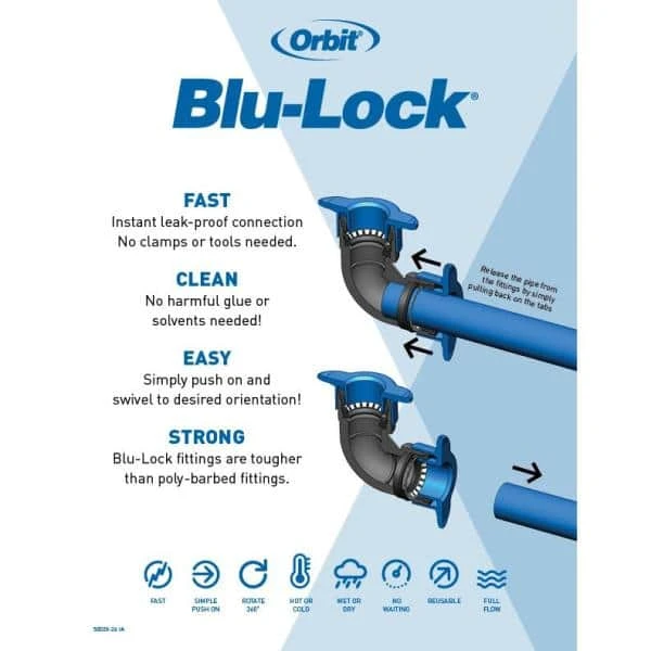 Enjoy the convenience of an in-ground sprinkler system without the hassle of connecting to an in-ground water source. The patented Blu-Lock system uses a revolutionary stainless steel retaining ring that grips the flexible pipe from the outside permitting a quick, easy-to-slide-on fitting which installs 80% faster and is 25% stronger than traditional barb fittings, providing you a stronger system in less install time. Install 2 zones with the 12 pop-up gear drive sprinkler heads, which are easy to adjust with the water on or off, providing head-to-head coverage to ensure against dry spots. The digital timer offers oversized features for ease of use, a manual override option to allow watering flexibility while keeping programming intact, and heavy-duty weatherproof construction. Attach the dual outlet digital timer to your outside faucet, to control 2 sprinkler zones, and enjoy a fully programmed sprinkler system in minutes for a well-maintained yard all season long.