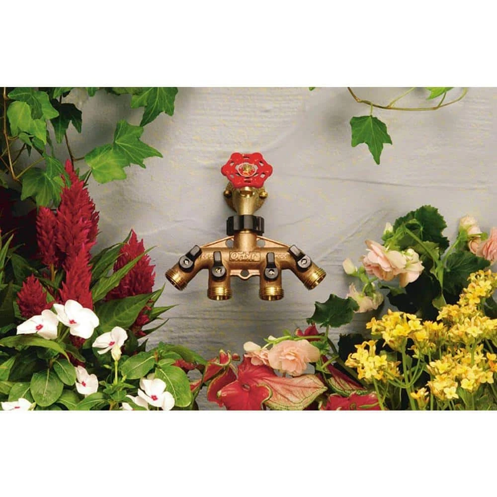 This 4-Outlet Brass Hose Faucet Manifold features shutoffs for use as sprinkler hose faucet valves or multiple hose connections (hoses not included). The manifold includes a leak-free ball valve and a mounting bracket for stability. The manifold has four male threaded Standard 3/4 in. connections. Not for indoor appliances