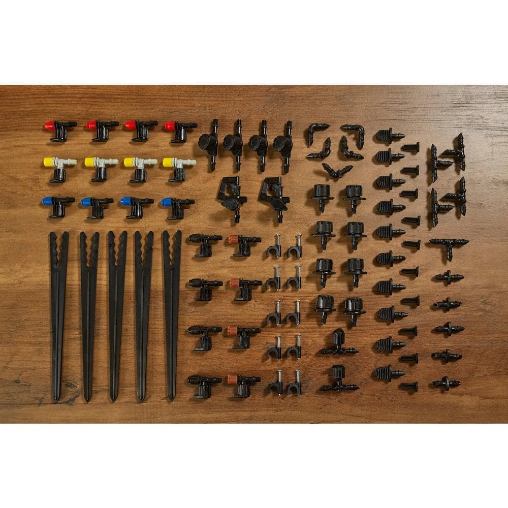 - Kit Includes: Included are (4) mist sprayers; (4) full-pattern, low-volume sprinklers; (4) half-pattern, low-volume sprinklers; (4) quarter-pattern, low-volume sprinklers; (4) strip-pattern, low-volume sprinklers; (4) multi-stream dripper emitters; (4) inline dripper emitters