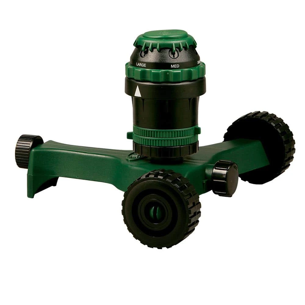 The H2O 6-gear drive sprinkler head from Orbit features a wheeled base and is easily adjustable to any size of yard. It has 6 different spray patterns that allow for watering small, medium and large areas. This Orbit sprinkler is as quiet as a whisper and can cover areas in a partial- or full-circle pattern. Its spike base has a flow-through design, so this water sprinkler can work singularly or in a connected series as part of an above ground watering system. It has solid, high-impact construction and is built to last. Features and Benefits: Covers areas up to 65 ft. 6 separate spray patterns make it ideal for any lawn size, Has part- or full-circle watering coverage, Features a spike base with flow-through design to connect to other sprinklers.