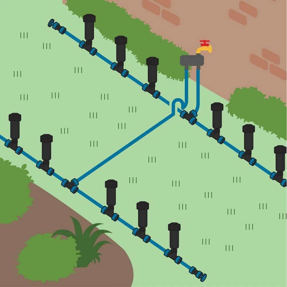Enjoy the convenience of an in-ground sprinkler system without the hassle of connecting to an in-ground water source. The patented Blu-Lock tubing system uses a revolutionary stainless steel retaining ring that grips the flexible pipe from the outside permitting a quick, easy-to-slide-on fitting which installs 80% faster and is 25% stronger than traditional barb fittings, providing you a stronger system in less install time. The 6 pop-up gear drive sprinkler heads are easy to adjust with the water on or off, providing head-to-head coverage to ensure against dry spots. The digital timer offers oversized features for ease of use, a manual override option to allow watering flexibility while keeping programming intact, and heavy-duty weatherproof construction. Attach the digital timer to your outside faucet, and enjoy a fully programmed sprinkler system in minutes for a well-maintained yard all season long.