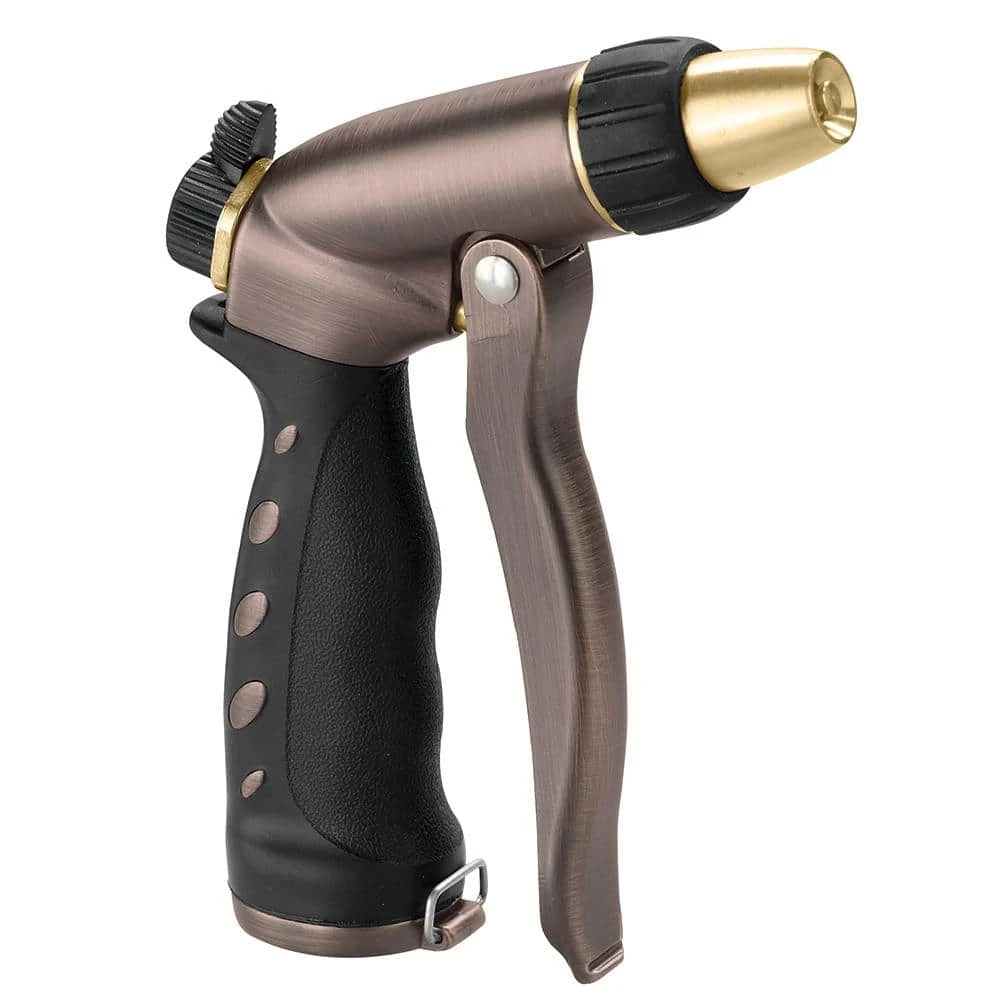 This nozzle is fully adjustable and will spray from a fine mist for watering delicate plants to a jet stream for cleaning sidewalks and driveways. The adjustable nozzle is constructed out of metal for added durability and extended life. The hand grip is insulated not only to protect the hand from the temperature of the water, but also to provide a comfortable grip. For custom water pressure, a flow control knob allows a quick adjustment to the flow of water without going back to the faucet. A locking mechanism on the trigger holds the trigger in place, allowing continuous water flow which helps reduce hand fatigue.