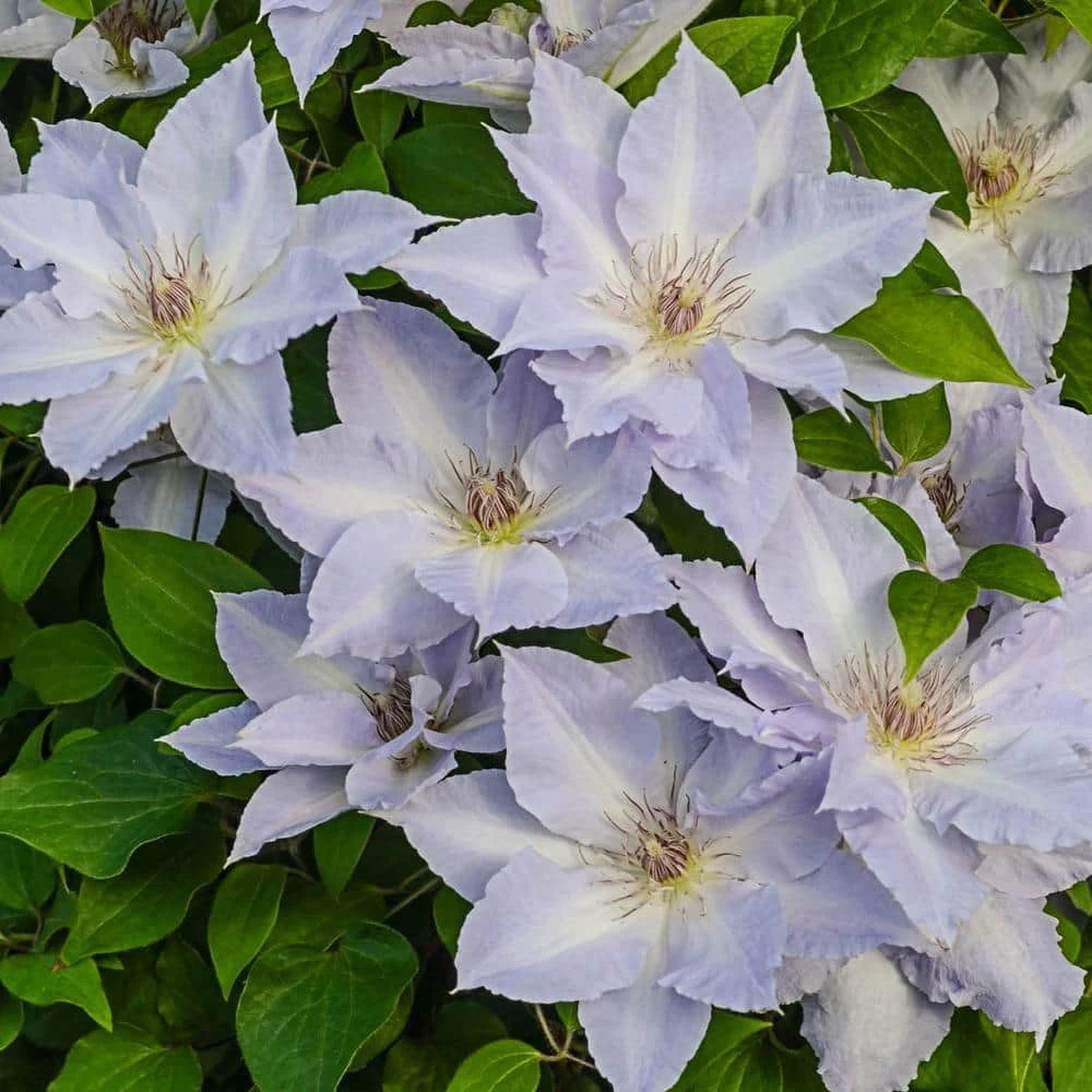 The pale flowers of Tranquilite Clematis will really light up a shaded area. It is compact, which is excellent for smaller sites. Tranquilite responds well to pruning back, giving it a nice, bushy form that looks best in a container. The flowers bloom close together, creating 1 dense floral display that really wows. In containers, pair it with annuals around the base of the vine to keep the roots shaded and the display interesting when the clematis isn’t blooming. Include an obelisk or trellis for the vines to climb up and you’ll have a gorgeous multi-level container garden. We also love Tranquilite cascading over the side of a window box or crawling through a perennial bed.