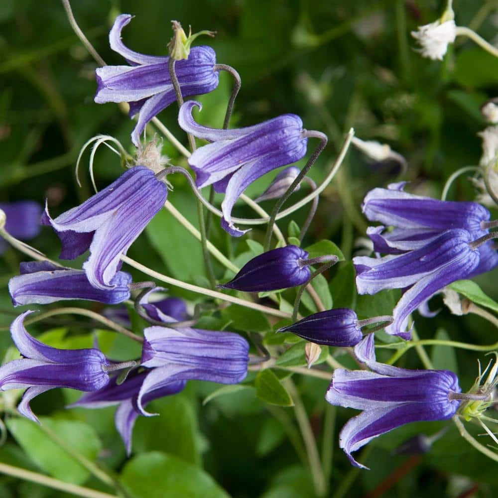 Clematis Roguchi is a non-vining clematis that features bell shaped flowers, that have a bluish-purple color. When summer comes, hundreds of these beautiful flowers cover the plant, giving great color to a border. Because Roguchi is a non-vining Clematis that you can let it grow amongst your perennial plantings providing a wonder contrast of color and height.