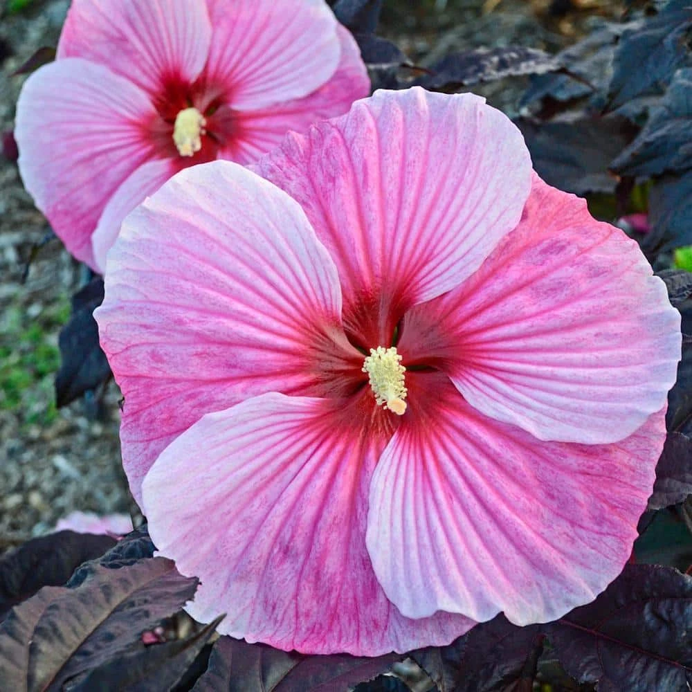 Starry Night Hibiscus produces plentiful, show stopping pinwheel blossoms of pale pink that are heavily veined in dark pink and sport deep red eyes. They are magnificent in full bloom when 7 in. to 8 in. flowers cover the plant from top to bottom. The foliage is just as nice in shades of near black with a maplelike form. It makes a fine species planting near an entryway, or plant in a decorative container that can be moved around the landscape.